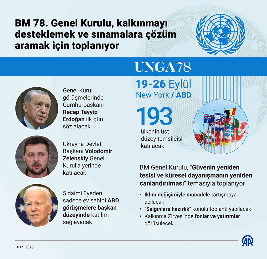 Birleşmiş Milletler (BM) üyesi ülkelerin devlet ve hükümet başkanları, bakanları ve delegasyonları bir araya getiren BM Genel Kurulu görüşmelerinin 78'incisi, 19 Eylül'de New York'ta başlayacak.(Grafik: Elmurod Usubaliev/AA)18 Eylül 2023•Güncelleme: 18 Eylül 2023