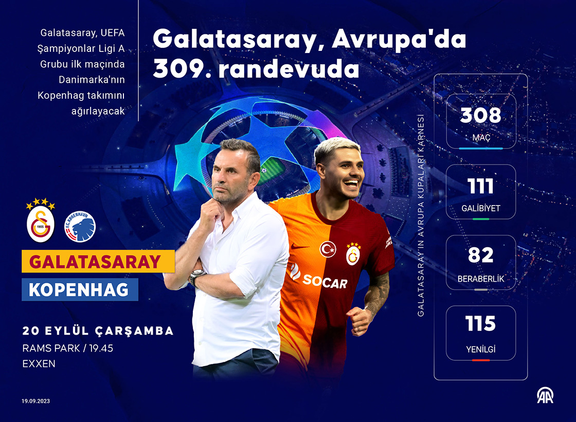 UEFA Şampiyonlar Ligi A Grubu ilk maçında Danimarka'nın Kopenhag takımını ağırlayacak Galatasaray, Avrupa kupalarında 309. mücadelesine çıkacak.(Grafik: Efnan İpşir/AA)