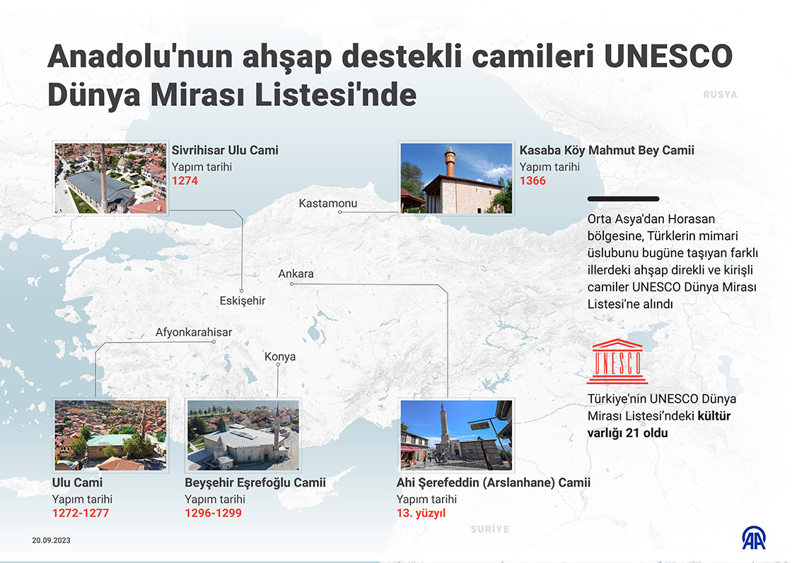 Orta Asya'dan Horasan bölgesine, Türklerin mimari üslubunu bugüne taşıyan farklı illerdeki ahşap direkli ve kirişli camiler UNESCO Dünya Mirası Listesi'ne alındı.(Grafik: Omar Zaghloul/AA)