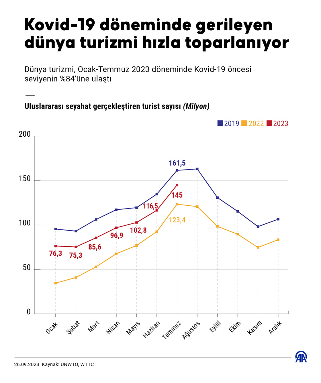 Turizm sektörü, 2023'ün başından bu yana uluslararası seyahat eden yaklaşık 700 milyon turist sayısına ulaşarak Kovid-19'un ardından hızla toparlanmaya devam ediyor.(Grafik: Efnan İpşir/AA)