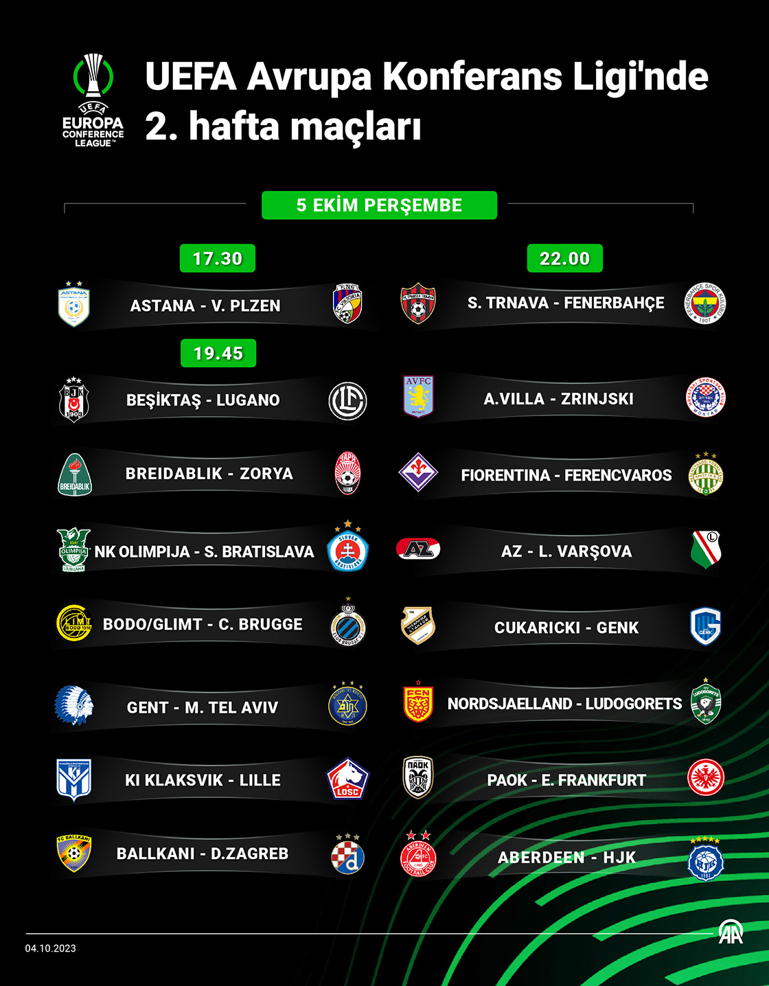 UEFA Avrupa Konferans Ligi'nde 2023-2024 sezonu gruplarında ikinci hafta maçları 5 Ekim'de oynanacak. (Grafik: Kemal Delikmen/AA)