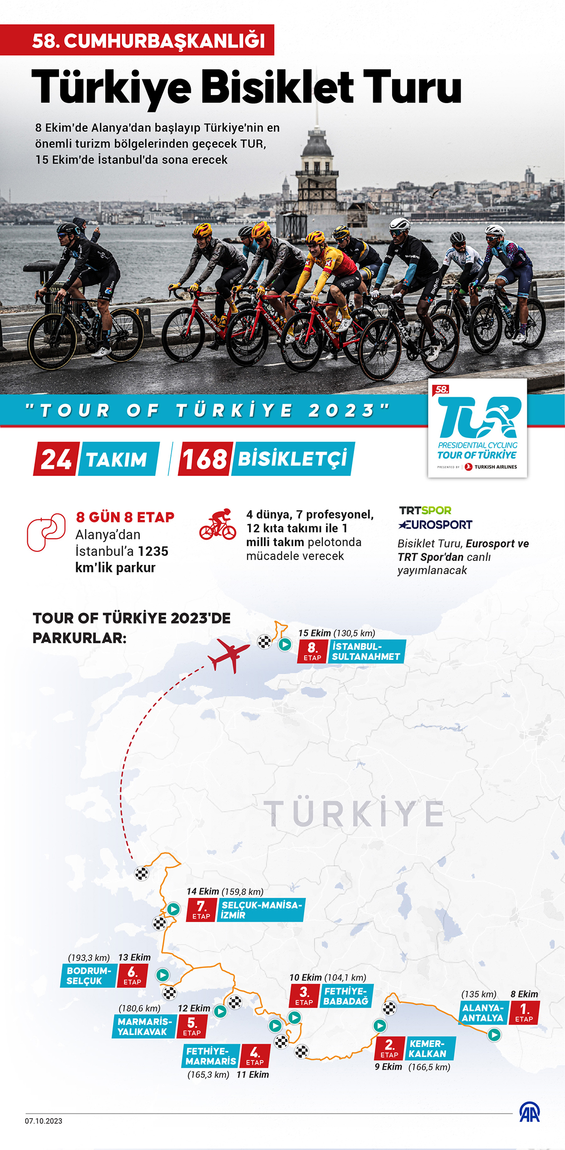 İlki 1963 yılında 'Marmara Turu' olarak düzenlenen ve ilk kez 1965 yılında uluslararası statü kazanan organizasyon, 1966 yılında Cumhurbaşkanlığı makamı himayesine alındı. Turun 58'incisi Alanya'da başlayıp, 15 Ekim'de İstanbul'da sona erecek. (Grafik: Muhammed Ali Yiğit/AA)07 Ekim 2023•Güncelleme: 07 Ekim 2023