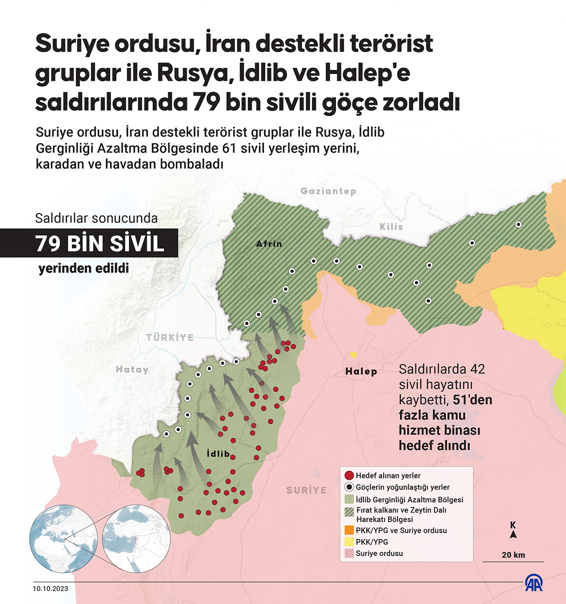 Suriye ordusu, İran destekli terörist gruplar ile Rusya, İdlib Gerginliği Azaltma Bölgesinde 61 sivil yerleşim yerini, karadan ve havadan bombaladı. (Grafik: Mahmut Resul Karaca/AA)10 Ekim 2023•Güncelleme: 10 Ekim 2023