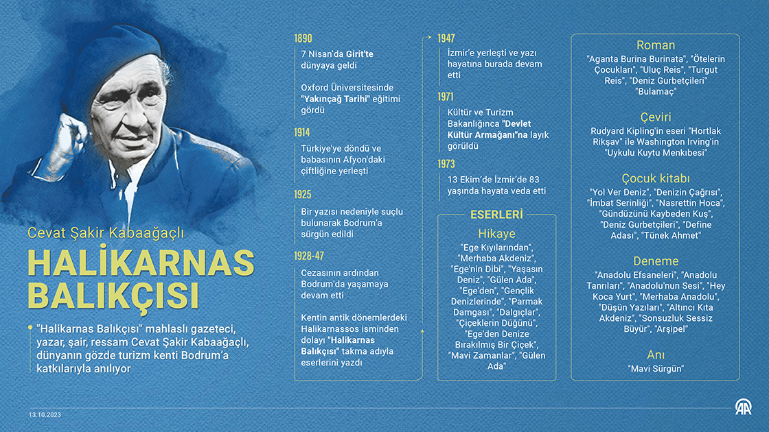 "Halikarnas Balıkçısı" mahlaslı gazeteci, yazar, şair, ressam Cevat Şakir Kabaağaçlı, dünyanın gözde turizm kenti Bodrum’a katkılarıyla anılıyor.