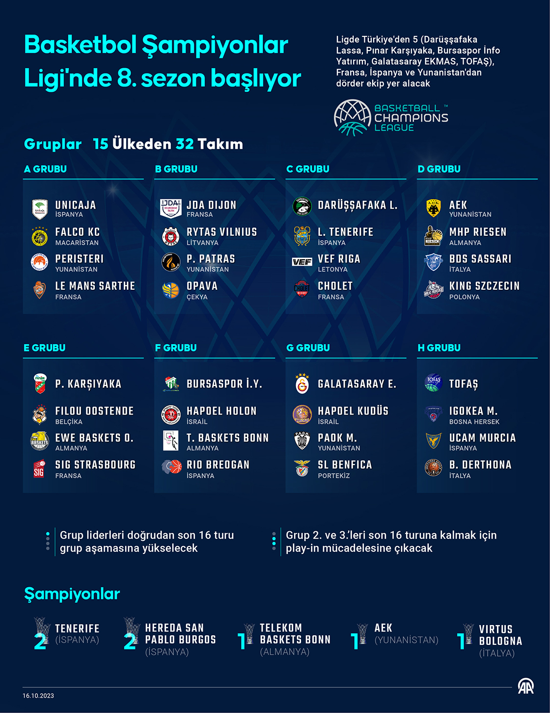 Ligde Türkiye'den 5 (Darüşşafaka Lassa, Pınar Karşıyaka, Bursaspor İnfo Yatırım, Galatasaray EKMAS, TOFAŞ), Fransa, İspanya ve Yunanistan'dan dörder ekip yer alacak. (Grafik: Mahmut Resul Karaca/AA