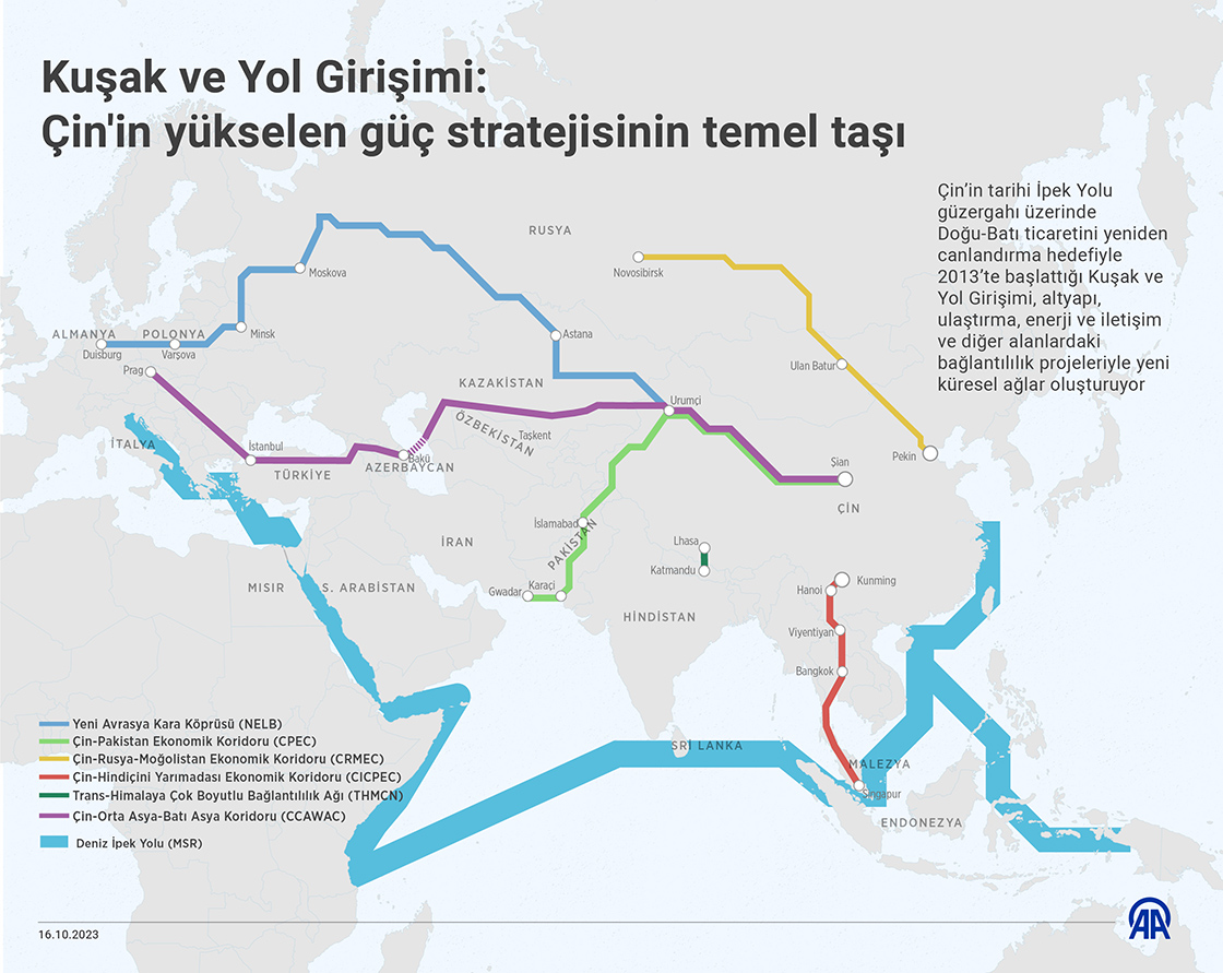 Çin'in tarihi İpek Yolu güzergahında Doğu-Batı ticaretini yeniden canlandırma hedefiyle 2013'te başlattığı Kuşak ve Yol Girişimi (BRI), 10 yılda 155 ülkenin katılımı ve 70'ten fazla ülkede yürütülen projelerle dünya nüfusunun 3'te 2'sini, küresel gayrisafi hasılanın yarısından fazlasını içeren etki alanı oluşturdu. ( Omar Zaghloul - Anadolu Ajansı )16 Ekim 2023•Güncelleme: 16 Ekim 2023