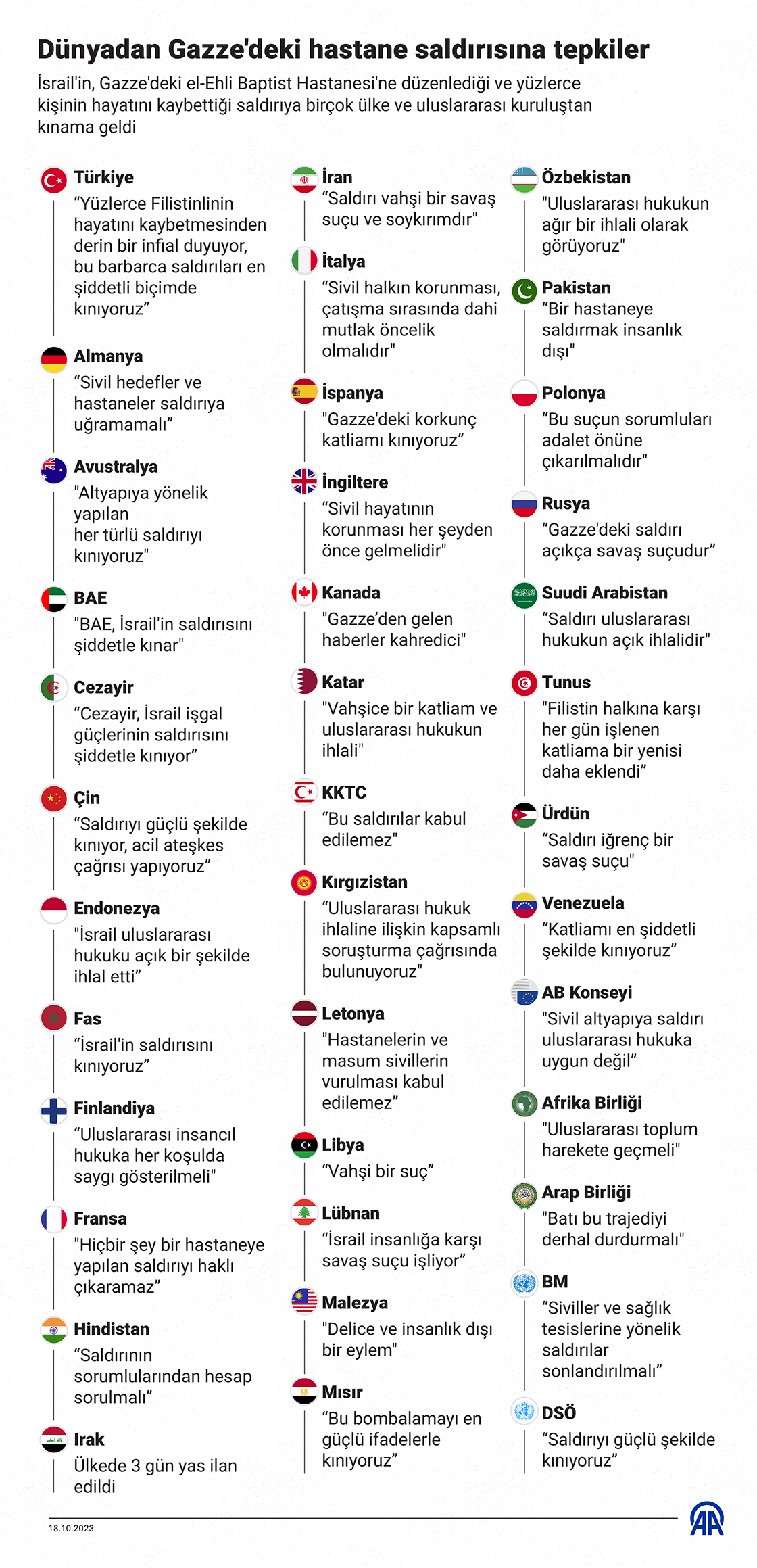İsrail'in, Gazze'deki el-Ehli Baptist Hastanesi'ne düzenlediği ve yüzlerce kişinin hayatını kaybettiği saldırıya birçok ülke ve uluslararası kuruluştan kınama geldi. (Grafik: Omar Zaghloul/AA)