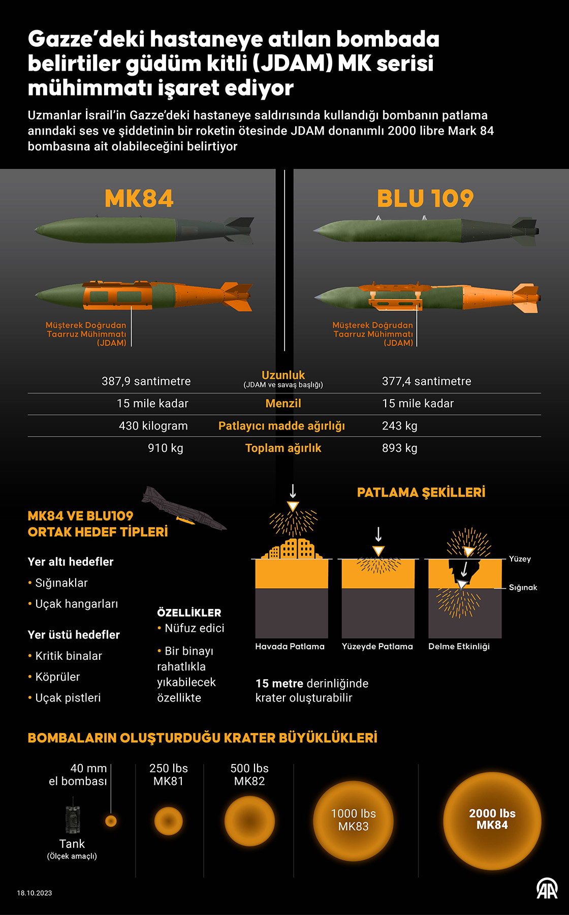 Uzmanlar İsrail’in Gazze’deki hastaneye saldırısında kullandığı bombanın patlama anındaki ses ve şiddetinin bir roketin ötesinde JDAM donanımlı 2000 libre Mark 84 bombasına ait olabileceğini belirtiyor. (Grafik: Yasin Demirci/AA)18 Ekim 2023•Güncelleme: 18 Ekim 2023