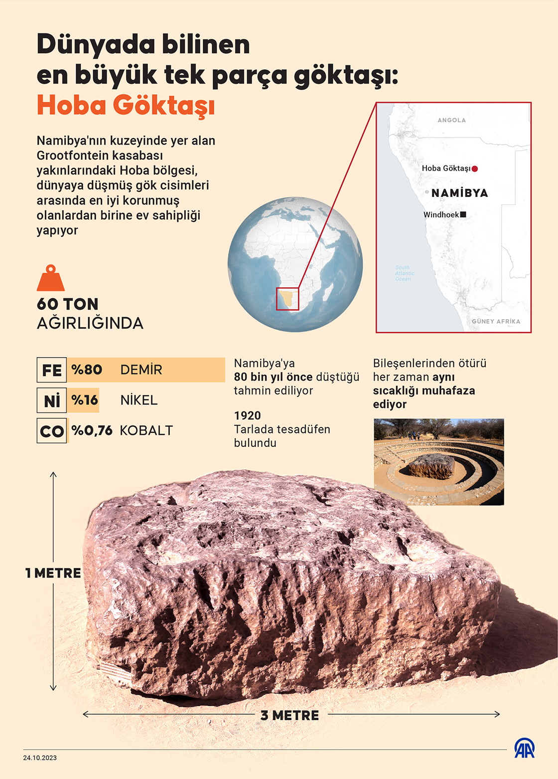 Güney Afrika ülkesi Namibya'da bulunan Hoba Göktaşı, dünyada bilinen en büyük tek parça göktaşı olma özelliği taşıyor. (Grafik: Yasin Demirci/AA)