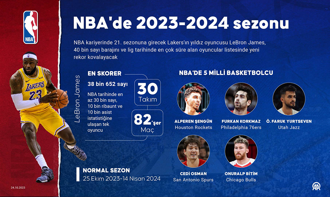 NBA kariyerinde 21. sezonuna girecek Lakers'ın yıldız oyuncusu LeBron James, 40 bin sayı barajını ve lig tarihinde en çok süre alan oyuncular listesinde yeni rekor kovalayacak. (Grafik: Efnan İpşir/AA)