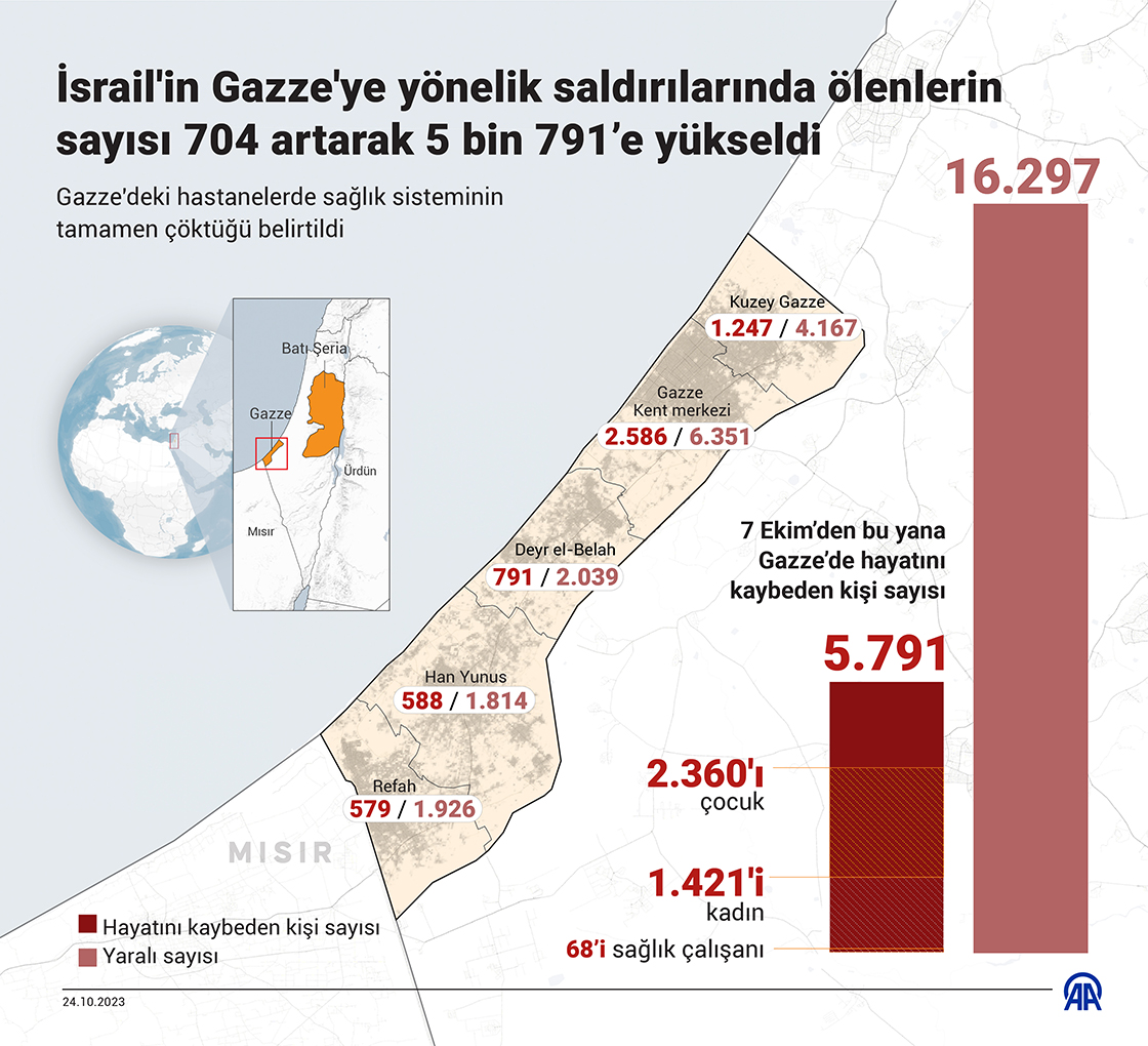 İsrail'in Gazze'ye yönelik saldırılarında ölenlerin sayısı 704 artarak 5 bin 791’e yükseldi