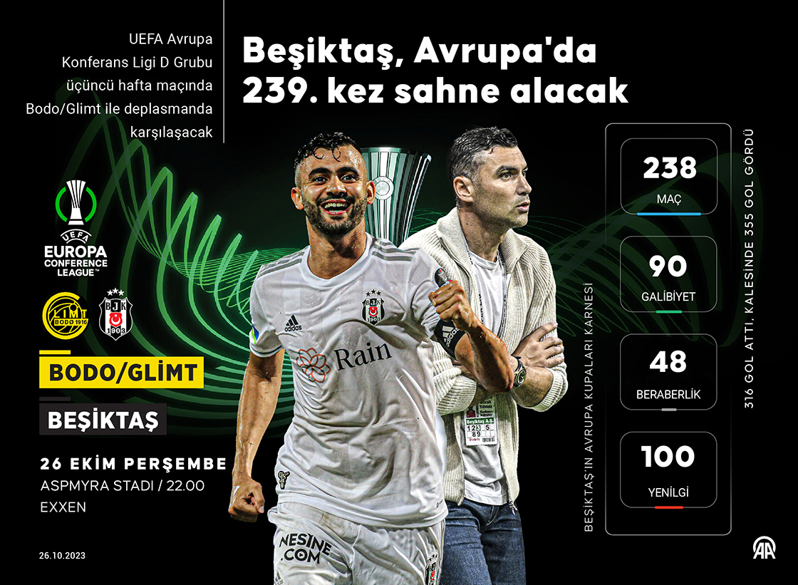 UEFA Avrupa Konferans Ligi D Grubu üçüncü hafta maçında Norveç ekibi Bodo/Glimt ile deplasmanda karşılaşacak Beşiktaş, Avrupa'da 239. kez sahne alacak. (Grafik: Kemal Delikmen/AA)
