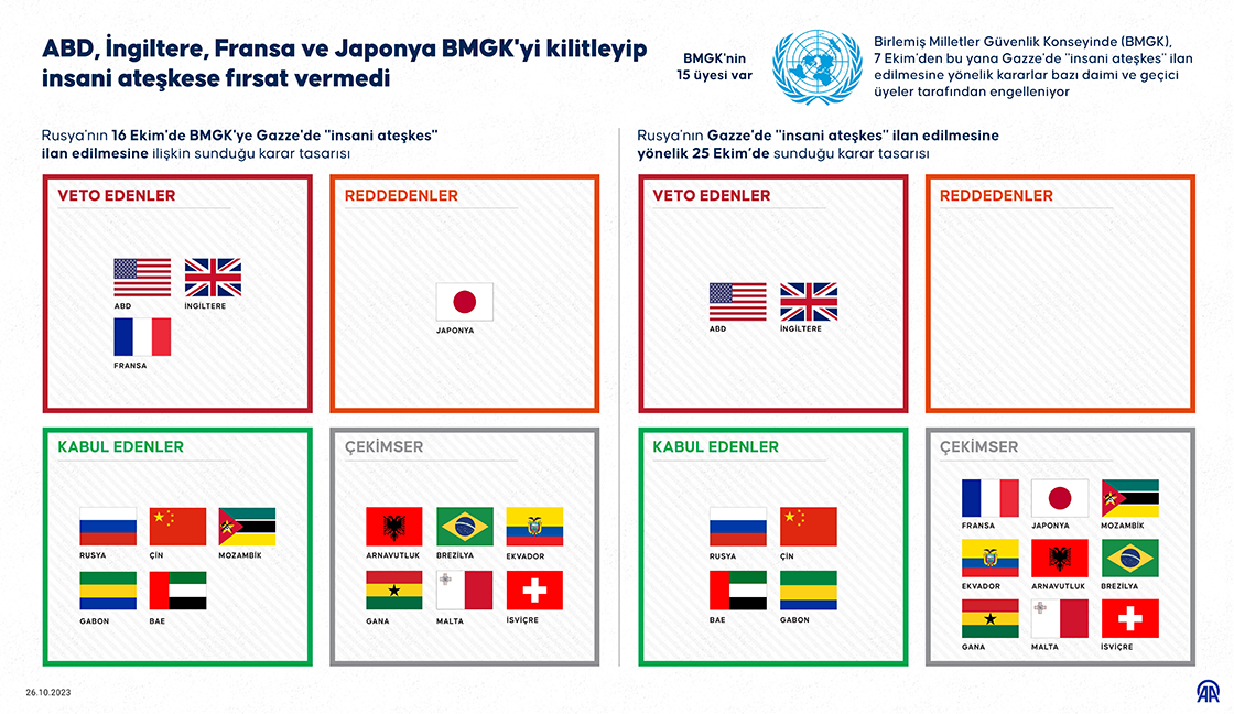 Birlemiş Milletler Güvenlik Konseyinde (BMGK), İsrail ile Hamas arasında çatışmaların başladığı 7 Ekim'den bu yana Gazze'de 'insani ateşkes' ilan edilmesine yönelik kararlar bazı daimi ve geçici üyeler tarafından engelleniyor. (Grafik: Yasin Demirci/AA)26 Ekim 2023•Güncelleme: 26 Ekim 2023