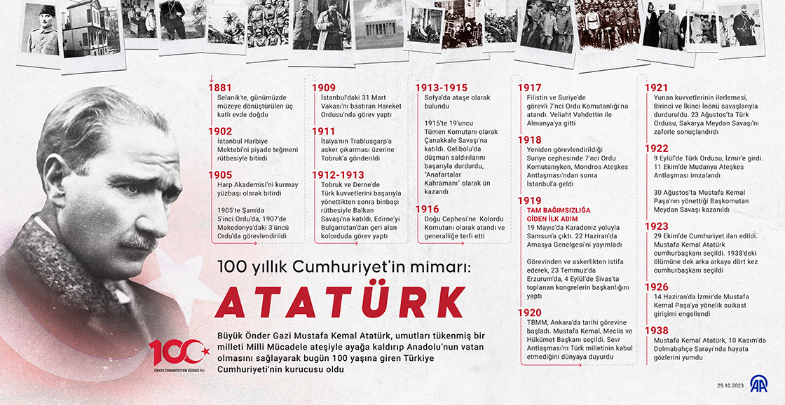 Büyük Önder Gazi Mustafa Kemal Atatürk, umutları tükenmiş bir milleti Milli Mücadele ateşiyle ayağa kaldırıp Anadolu’nun vatan olmasını sağlayarak bugün 100 yaşına giren Türkiye Cumhuriyeti'nin kurucusu oldu. (Grafik: Kemal Delikmen/AA)