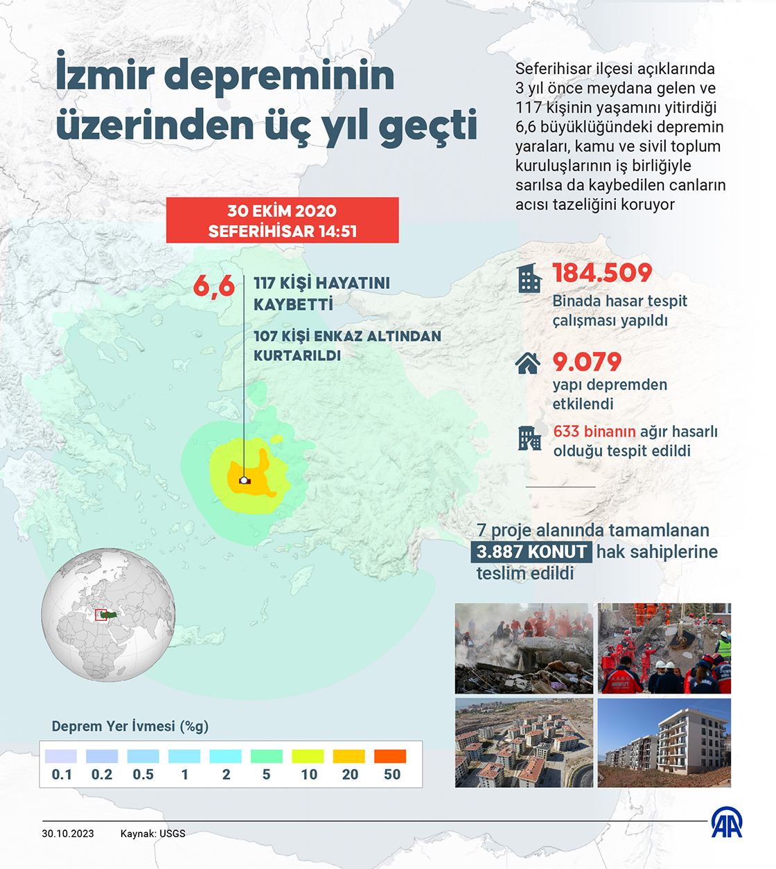 Seferihisar ilçesi açıklarında 3 yıl önce meydana gelen ve 117 kişinin yaşamını yitirdiği 6,6 büyüklüğündeki depremin yaraları, kamu ve sivil toplum kuruluşlarının iş birliğiyle sarılsa da kaybedilen canların acısı tazeliğini koruyor. (Grafik: Mahmut Resul Karaca/AA)30 Ekim 2023•Güncelleme: 30 Ekim 2023