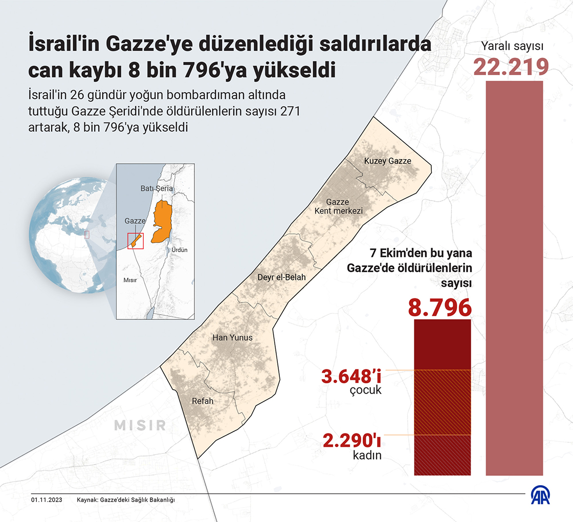 İsrail'in Gazze'ye düzenlediği saldırılarda can kaybı 8 bin 796'ya yükseldi