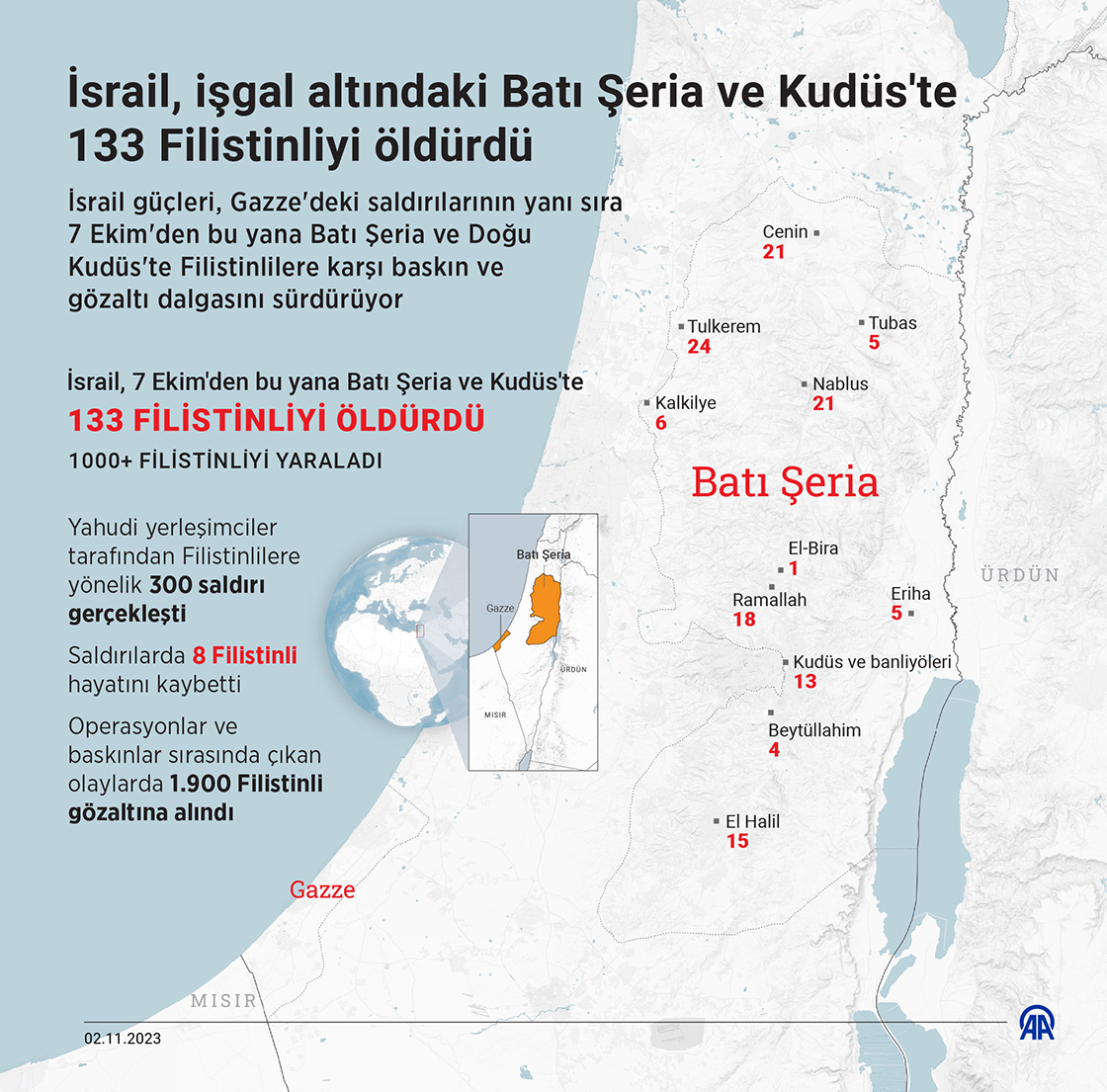 İsrail güçleri, işgal altındaki Batı Şeria, Kudüs ve çevresinde, 7 Ekim'den bu yana 133 Filistinliyi öldürdü, 1000'den fazla Filistinliyi yaraladı. (Grafik: Elmurod Usubaliev/AA)