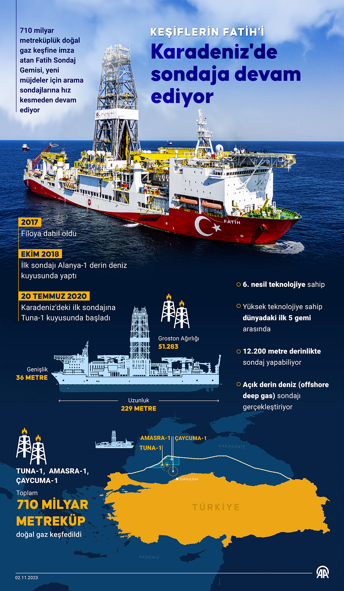 Karadeniz'de son yıllarda yaptığı sondajlarla 710 milyar metreküplük doğal gaz keşfine imza atan Fatih Sondaj Gemisi, yeni müjdeler için arama faaliyetlerine hız kesmeden devam ediyor. (Grafik: Muhammed Ali Yiğit/AA)