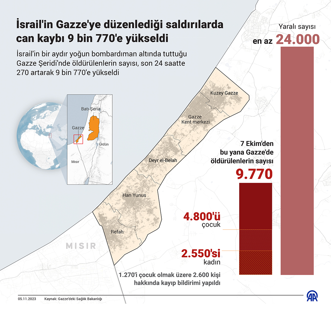 İsrail'in bir aydır yoğun bombardıman altında tuttuğu Gazze Şeridi'nde öldürülenlerin sayısı, son 24 saatte 270 artarak 9 bin 770'e yükseldi. (Grafik: Elmurod Usubaliev/AA)