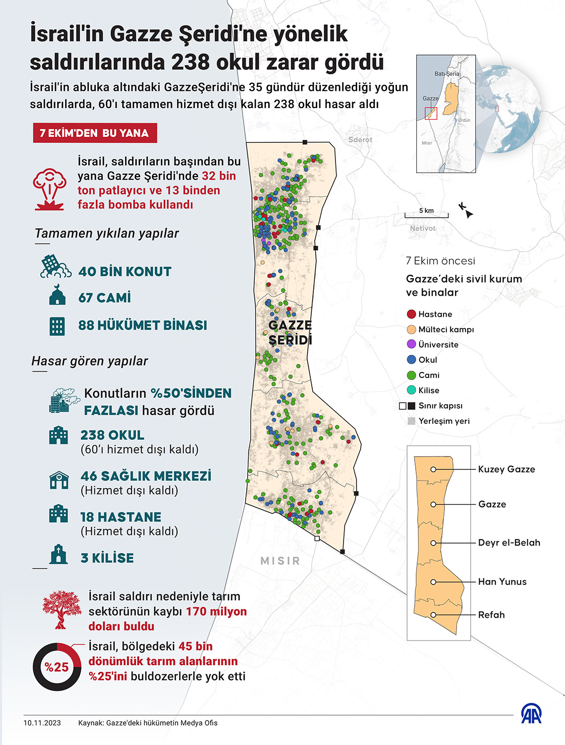 İsrail'in abluka altındaki Gazze Şeridi'ne 35 gündür düzenlediği yoğun saldırılarda 60'ı kullanılmayacak derecede 238 okul hasar aldı. (Grafik: Omar Zaghloul/AA)