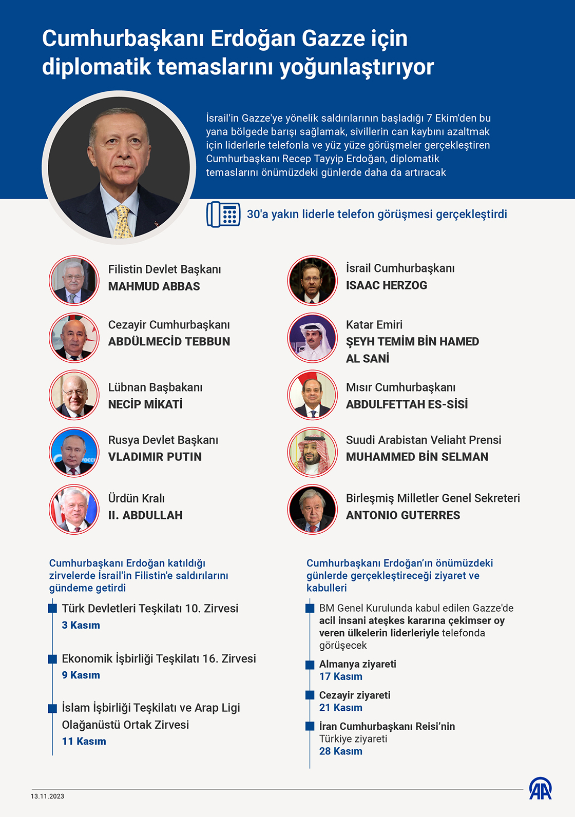İsrail'in Gazze'ye yönelik saldırılarının başladığı 7 Ekim'den bu yana bölgede barışı sağlamak, sivil can kaybını azaltmak için liderlerle telefonla ve yüz yüze görüşmeler gerçekleştiren Cumhurbaşkanı Recep Tayyip Erdoğan, diplomatik temaslarını önümüzdeki günlerde daha da artıracak. (Grafik: Omar Zaghloul/AA)13 Kasım 2023•Güncelleme: 13 Kasım 2023