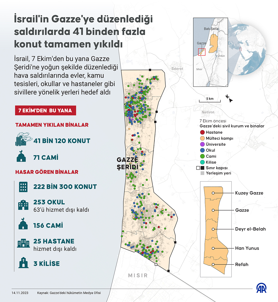 İsrail, 7 Ekim'den bu yana Gazze Şeridi'ne yoğun şekilde düzenlediği hava saldırılarında evler, kamu tesisleri, okullar ve hastaneler gibi sivillere yönelik yerleri hedef aldı. (Grafik: Elif Acar/AA)