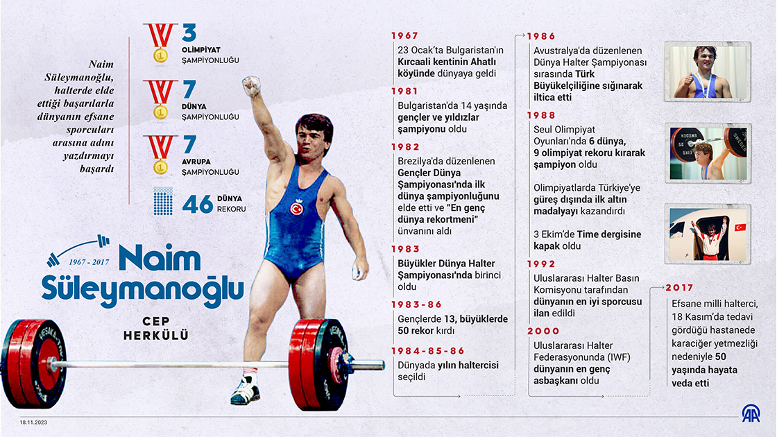Naim Süleymanoğlu, halterde elde ettiği başarılarla dünyanın efsane sporcuları arasına adını yazdırmayı başardı. (Grafik: Muhammed Ali Yiğit/AA)