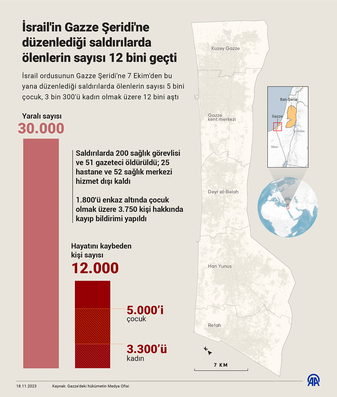 İsrail ordusunun Gazze Şeridi'ne 7 Ekim'den bu yana düzenlediği saldırılarda ölenlerin sayısı 5 bini çocuk, 3 bin 300'ü kadın olmak üzere 12 bini aştı. (Grafik: Kemal Delikmen/AA)