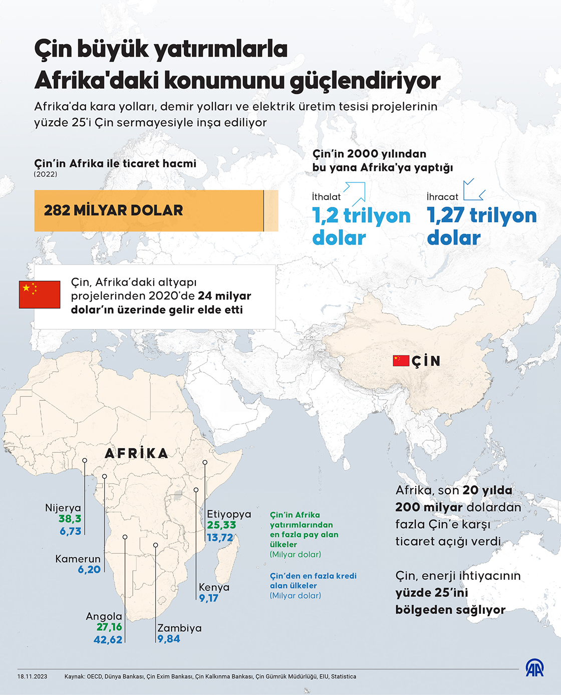 Afrika'nın en büyük ticaret ortağı olma rolünü 14 yıl üst üste sürdüren Çin, Afrika’daki karayolları, demiryolları ve elektrik üretim tesisi projelerinin %25’ini inşa ediliyor. (Grafik: Yasin Demirci/AA)