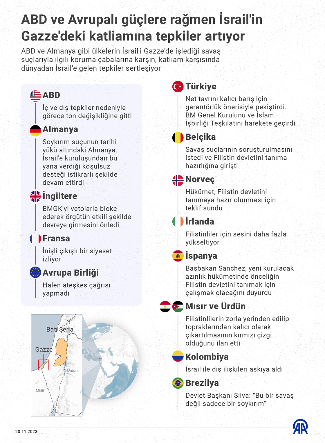 İsrail'in Gazze'de 13 bin kişiyi öldürdüğü, 6 bin kişiden ise haber alınamayan katliamı karşısında Güney Amerika'dan Avrupa kıtasına kadar tepkilerin dozu yükseliyor. (Grafik: Omar Zaghloul/AA)