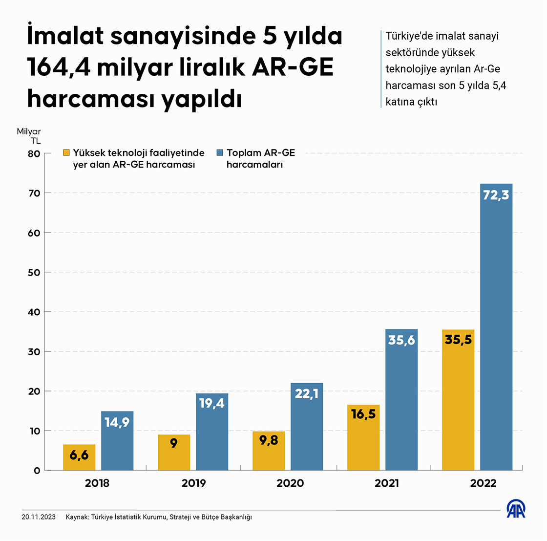 Türkiye'de imalat sanayi sektöründe yüksek teknolojiye ayrılan Ar-Ge harcaması son 5 yılda 5,4 katına çıktı. (Grafik: Muhammed Ali Yiğit/AA)