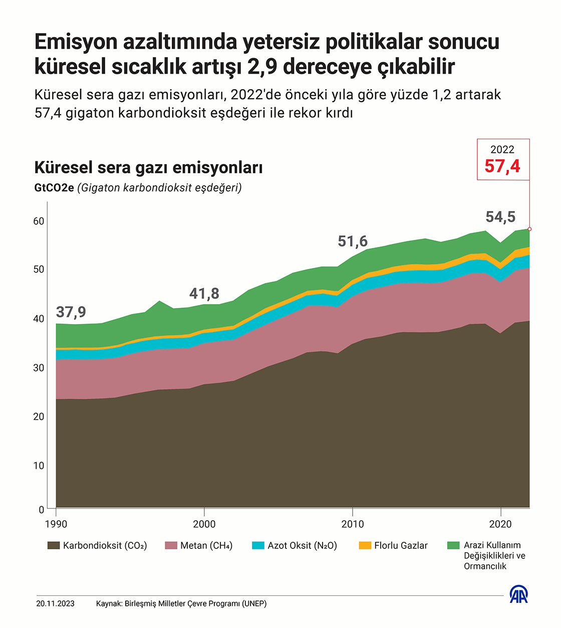 Küresel sıcaklıklar ve sera gazı emisyonları rekor kırarken, iklim değişikliğini önlemek için Paris Anlaşması kapsamında sera gazı emisyonlarının azaltılması için verilen yetersiz taahhütler, küresel sıcaklık artışını sanayi öncesi seviyelerin 2,5 ila 2,9 derece üzerine çıkarma riski oluşturuyor. (Grafik: Elmurod Usubaliev/AA)20 Kasım 2023•Güncelleme: 20 Kasım 2023
