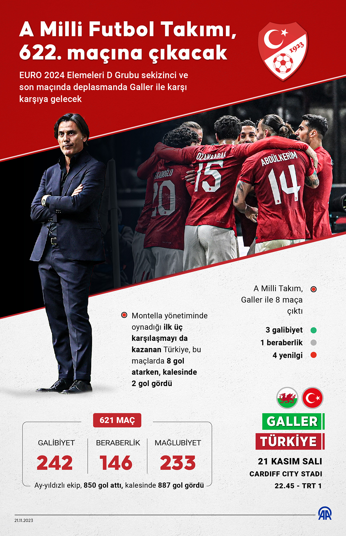 UEFA 2024 Avrupa Futbol Şampiyonası (EURO 2024) Elemeleri D Grubu sekizinci ve son maçında yarın deplasmanda Galler ile karşı karşıya gelecek A Milli Futbol Takımı, tarihindeki 622. müsabakaya çıkacak. (Grafik: Muhammed Ali Yiğit/AA)