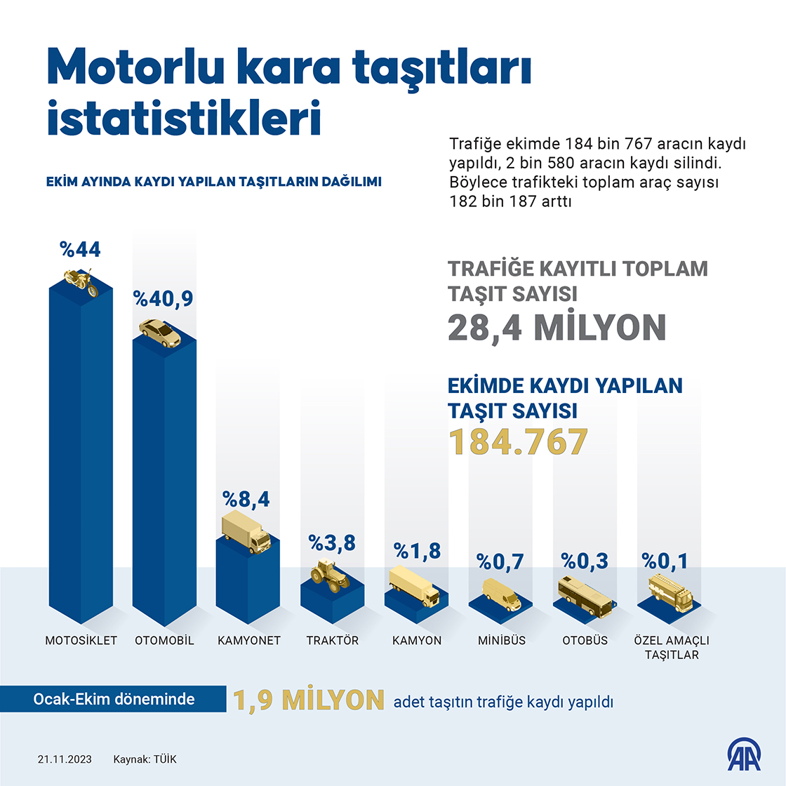 Trafiğe ekimde 184 bin 767 aracın kaydı yapıldı, 2 bin 580 aracın kaydı silindi. Böylece trafikteki toplam araç sayısı 182 bin 187 arttı. (Grafik: Efnan İpşir/AA)