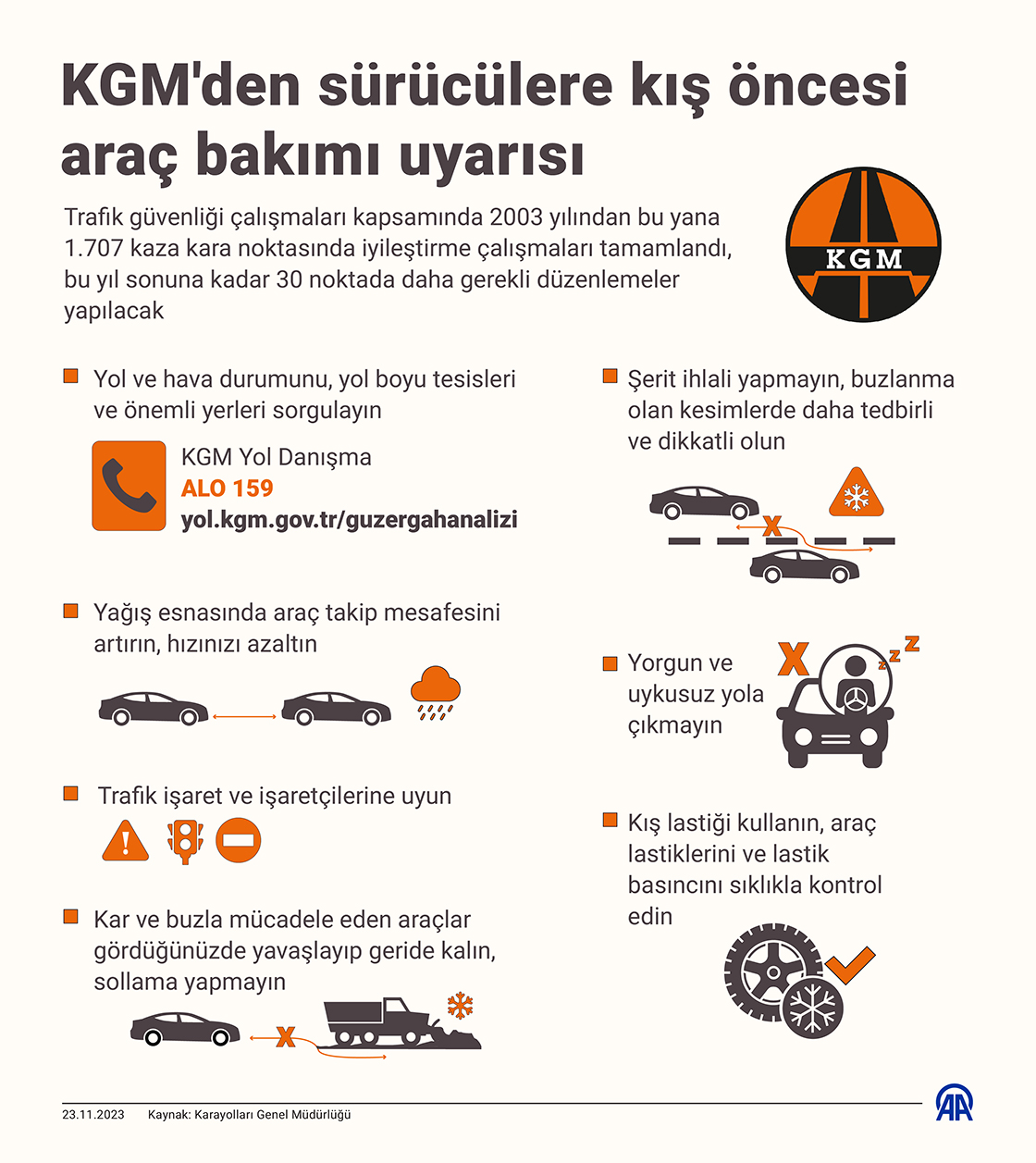 Karayolları Genel Müdürlüğü (KGM), yurt genelinde görülen kar yağışıyla birlikte kış öncesi sürücülere, araçlarını kış koşullarına hazırlamaları ve yola çıkarken dikkat etmeleri gereken hususlara yönelik uyarı yaptı. (Grafik: Omar Zaghloul/AA)23 Kasım 2023•Güncelleme: 23 Kasım 2023