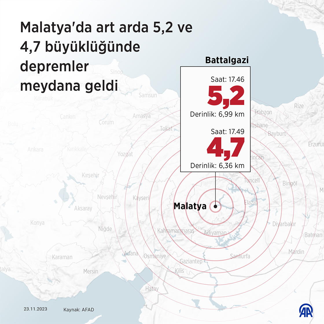 Malatya'da art arda 5,2 ve 4,7 büyüklüğünde depremler meydana geldi