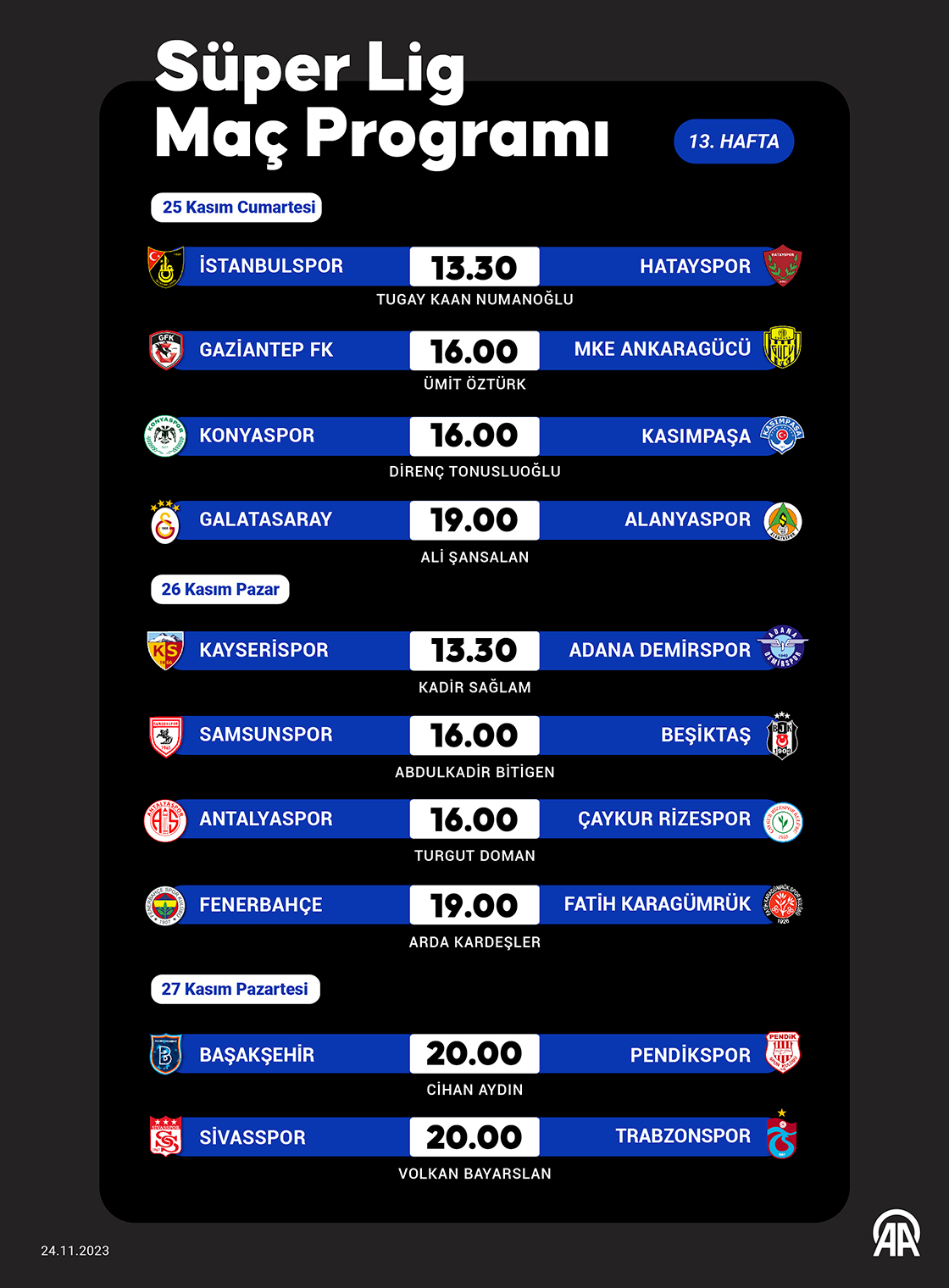 Trendyol Süper Lig'de 13. hafta maçları 25 Kasım Cumartesi günü dört maçla başlayacak. (Grafik: Kemal Delikmen/AA)