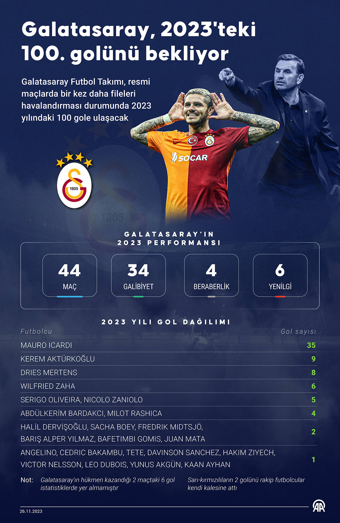 Galatasaray Futbol Takımı, resmi maçlarda bir kez daha fileleri havalandırması durumunda 2023 yılındaki 100 gole ulaşacak. (Grafik: Elmurod Usubaliev/AA)