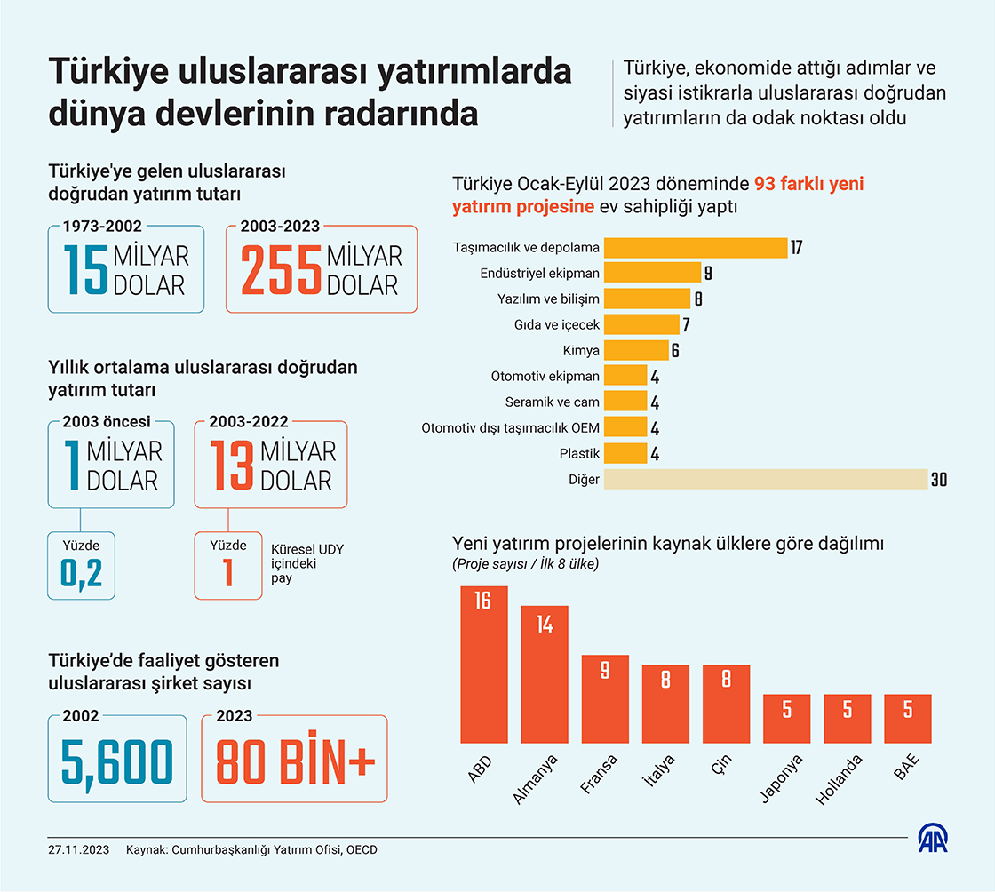 Türkiye, ekonomide attığı adımlar ve siyasi istikrarla uluslararası doğrudan yatırımların da odak noktası olurken Alibaba'dan Amazon'a, Huawei'den PepsiCo'ya kadar dünyanın önde gelen firmaları yeni yatırımlara yöneldi. (Grafik: Elmurod Usubaliev/AA)27 Kasım 2023•Güncelleme: 27 Kasım 2023