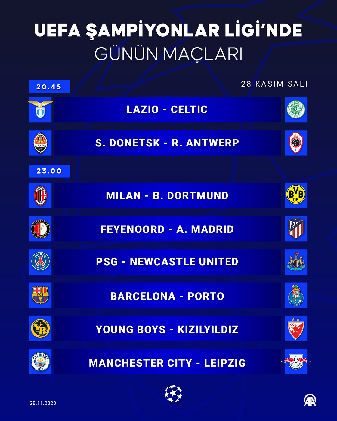 UEFA Şampiyonlar Ligi 2023-2024 sezonunda grup aşamasının beşinci haftası başlıyor. (Grafik: Kemal Delikmen/AA)