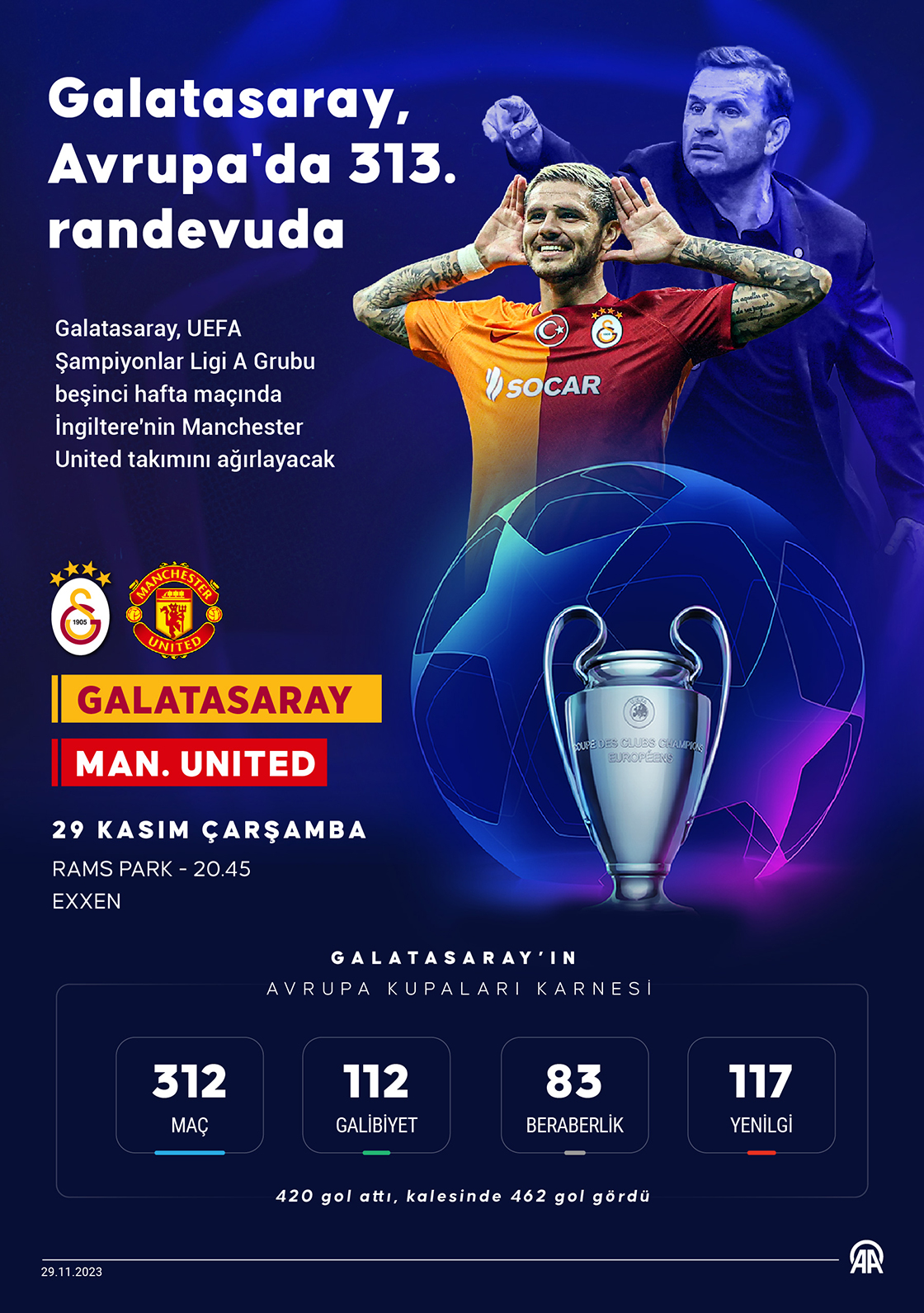 Galatasaray, UEFA Şampiyonlar Ligi A Grubu beşinci hafta maçında İngiltere'nin Manchester United takımını ağırlayacak. (Grafik: Kemal Delikmen/AA)