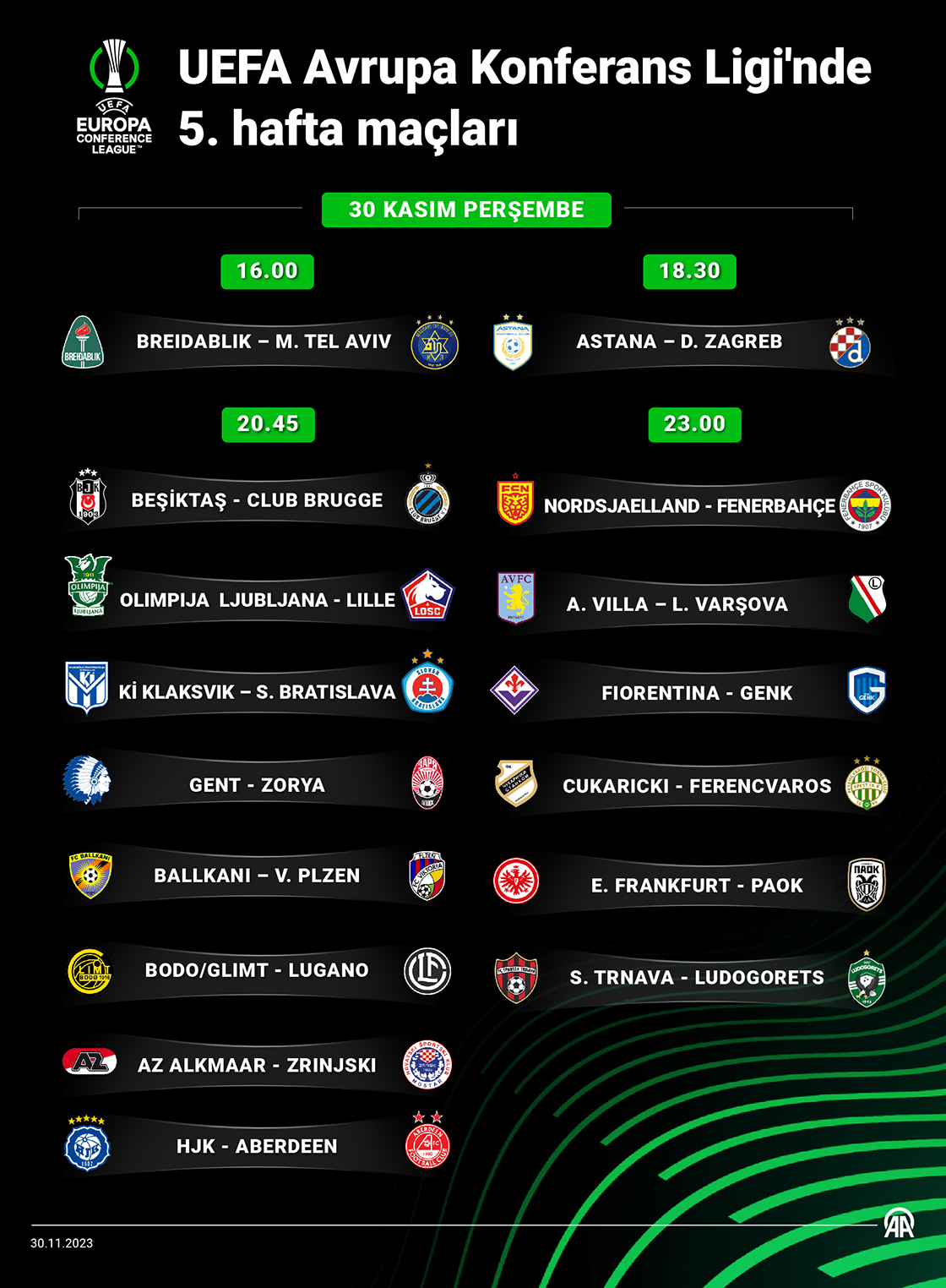 Türk takımlarından Beşiktaş, evinde Club Brugge, Fenerbahçe ise deplasmanda Nordsjaelland ile karşılaşacak. (Grafik: Efnan İpşir/AA)