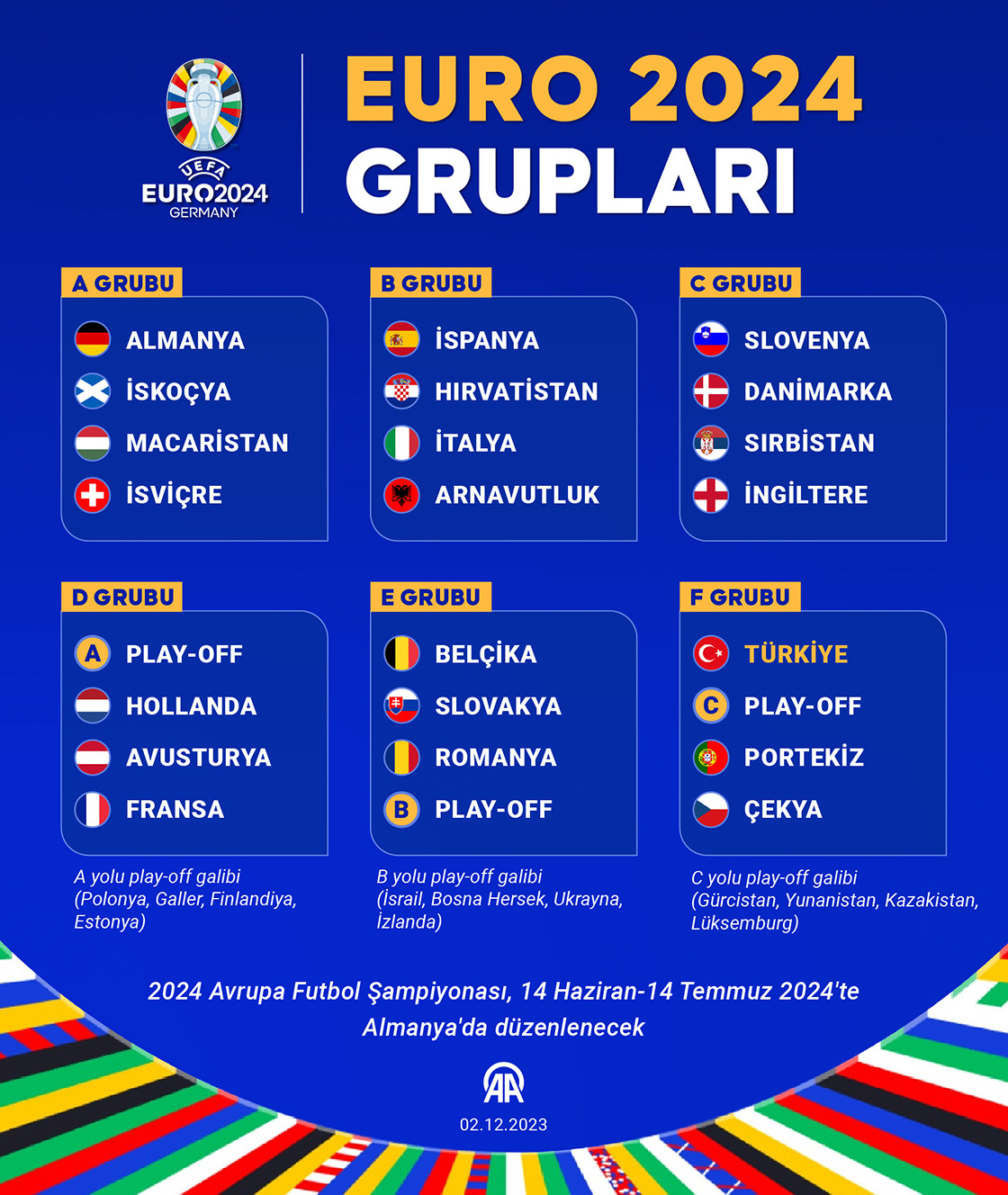 A Milli Futbol Takımı, 2024 Avrupa Şampiyonası'nda (EURO 2024) F Grubu'nda Portekiz, C yolu play-off galibi (Gürcistan, Yunanistan, Kazakistan, Lüksemburg) ve Çekya ile eşleşti. (Grafik: Kemal Delikmen / AA)