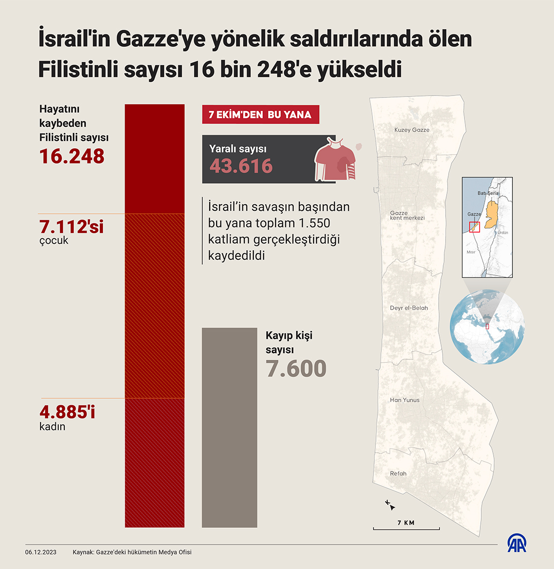 İsrail'in abluka altındaki Gazze Şeridi'ne 7 Ekim'den bu yana düzenlediği saldırılarda ölenlerin sayısı 16 bin 248'e yükseldi. (Grafik: Elif Acar/AA)