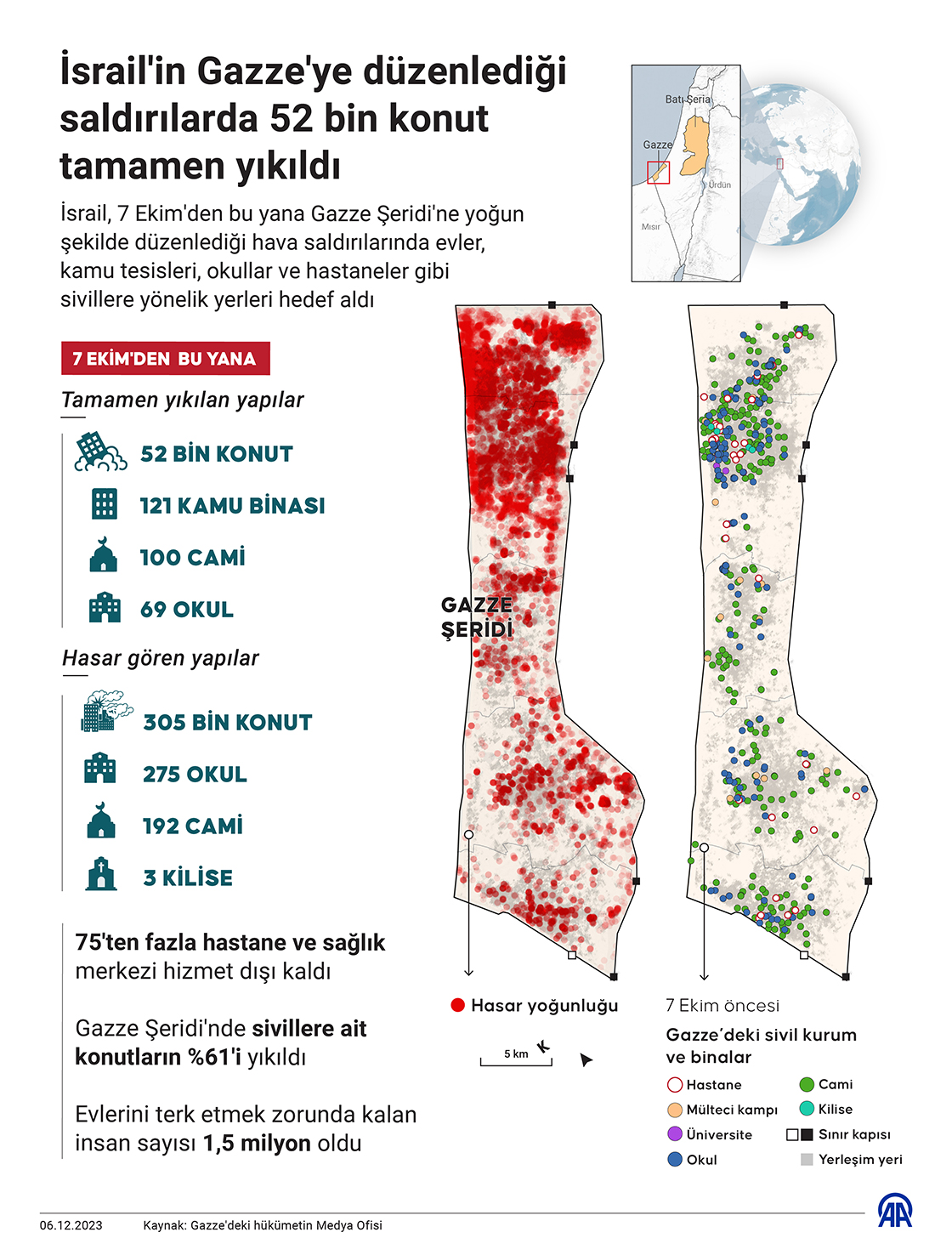 İsrail, 7 Ekim'den bu yana Gazze Şeridi'ne yoğun şekilde düzenlediği hava saldırılarında evler, kamu tesisleri, okullar ve hastaneler gibi sivillere yönelik yerleri hedef aldı. (Grafik: Elif Acar/AA)