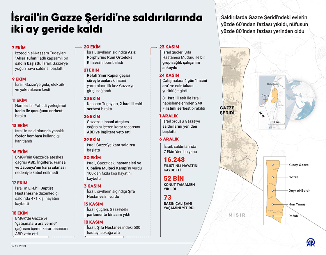 İsrail'in abluka altındaki Gazze Şeridi'nde yerleşim yerleri, hastane, okul, cami, kilise demeden 2 aydır düzenlediği saldırılarda 7 bin 112’si çocuk, 4 bin 885’i kadın toplam 16 bin 248 Filistinli öldürüldü, 43 binden fazla kişi yaralandı. (Grafik: Elmurod Usubaliev/AA)06 Aralık 2023•Güncelleme: 06 Aralık 2023