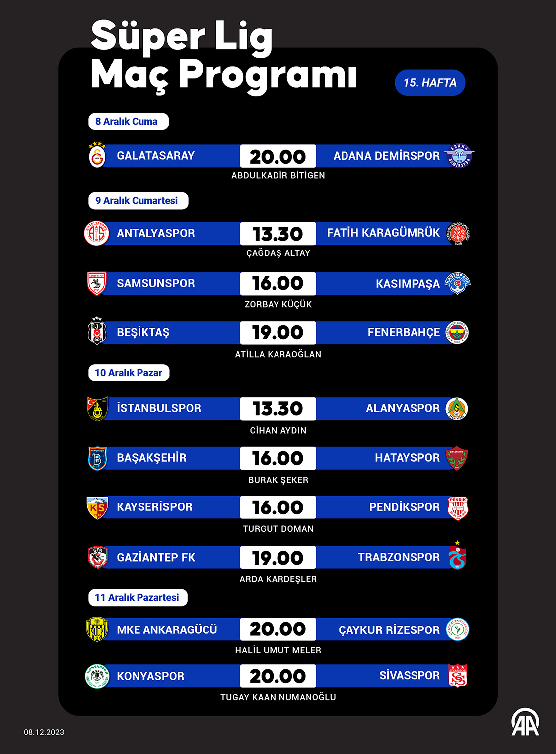 Süper Lig 15. hafta programı