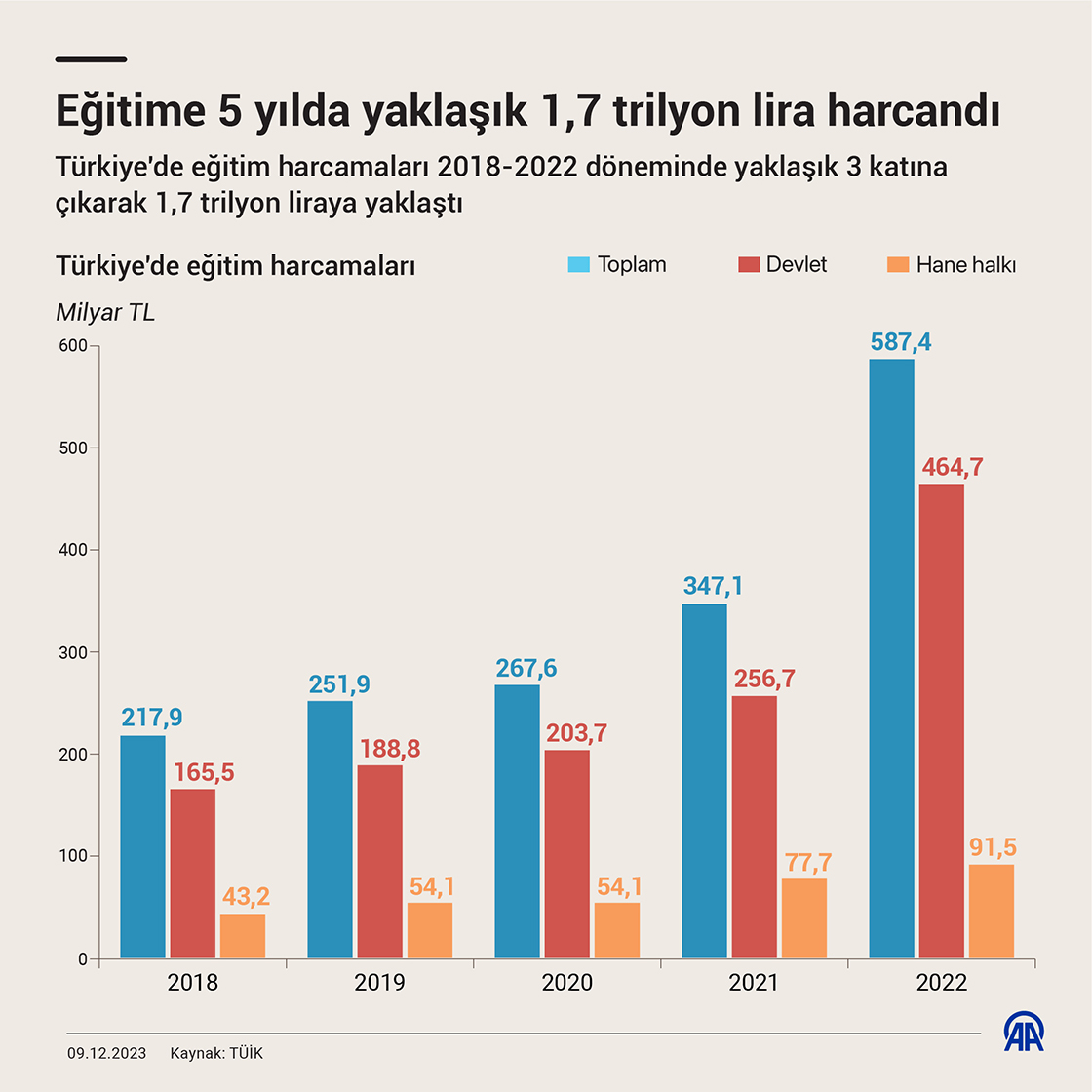 Türkiye'de eğitim harcamaları 2018-2022 döneminde yaklaşık 3 katına çıkarak 1,7 trilyon liraya yaklaştı. (Grafik: Elmurod Usubaliev/AA)