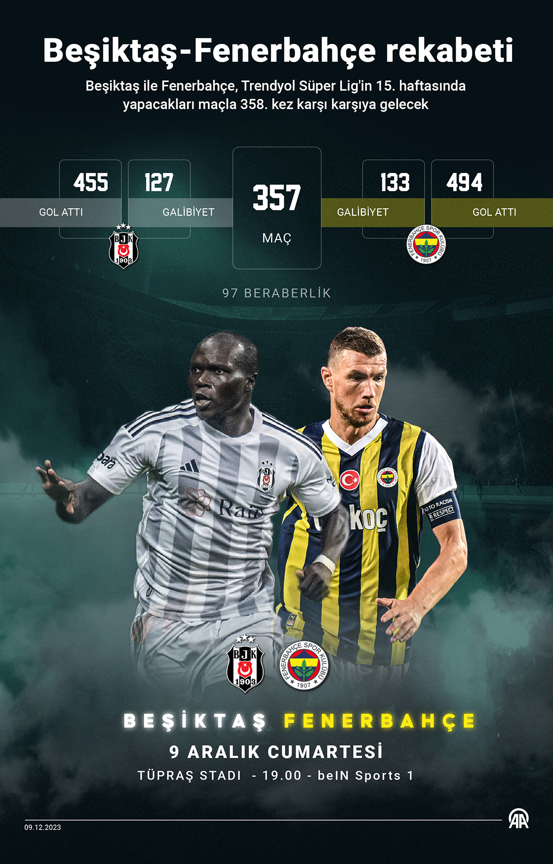 Beşiktaş ile Fenerbahçe, Trendyol Süper Lig'in 15. haftasında yapacakları maçla 358. kez karşı karşıya gelecek. (Grafik: Muhammed Ali Yiğit/AA)