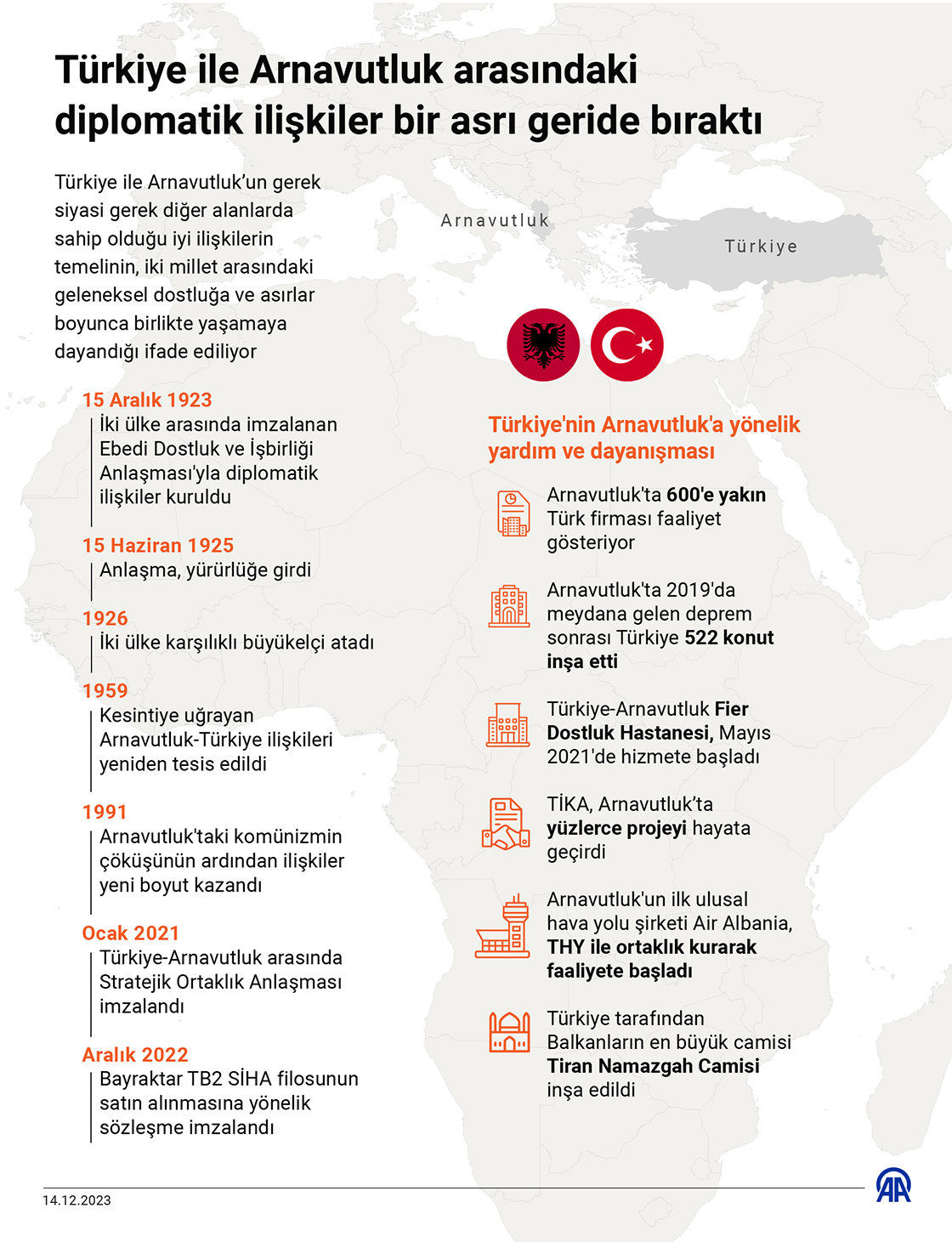 İki ülke arasında diplomatik ilişkiler, 15 Aralık 1923’te imzalanan Ebedi Dostluk ve İşbirliği Anlaşması ile resmen kurulurken, Arnavutluk'ta komünizmin 1991'de çöküşünün ardından yeni boyut kazandı. (Grafik: Omar Zaghloul/AA)14 Aralık 2023•Güncelleme: 14 Aralık 2023